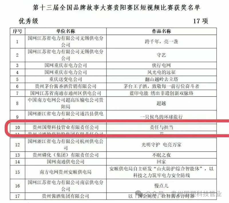 近日,从全国品牌故事大会(贵州赛区)传来振奋人心的好消息 —— 贵州国塑的短视频作品《背后的守护者》在激烈的角逐中脱颖而出,成功斩获短视频比赛优 秀奖!这一荣誉不仅是对作品创作理念的肯定,更是对贵州国塑多年来坚守 “默默守护城市生命线” 责任担当的认可。
